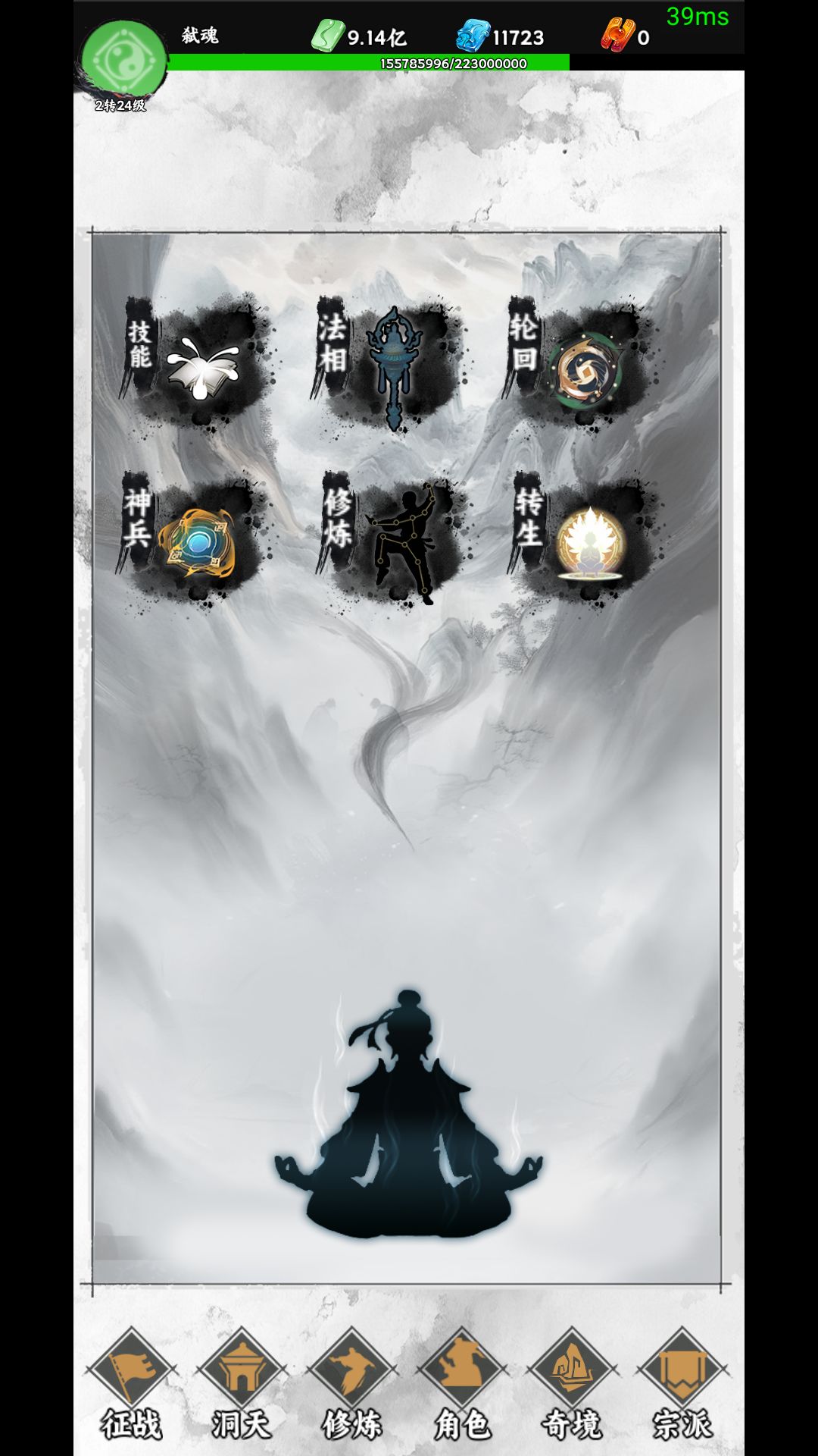 然后是修炼功能 目前里面六个功能法相和修炼没开发 其他 技能里可激活和升级技能 神兵里可升级和升星神兵 轮回里可按要求完成任务提升轮回加成 转生里是转生条件和触发证道转生