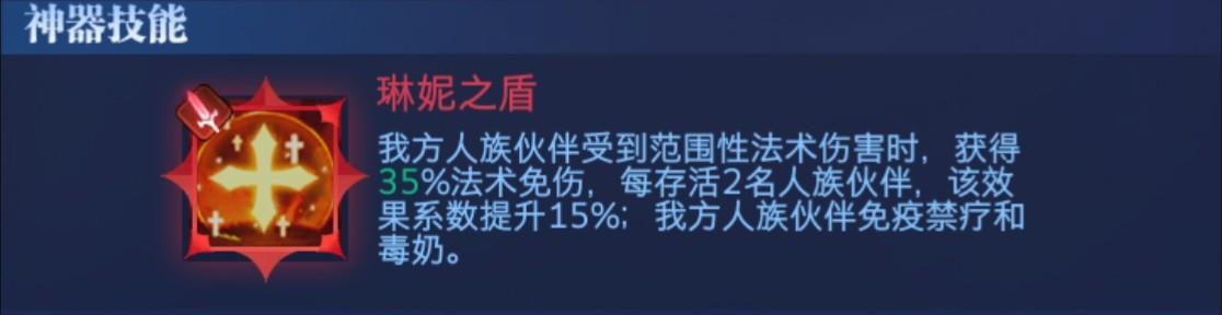 神器技能,我方人族伙伴受到范围性法术伤害时,获得35%法术免伤,每存活2名人族伙伴,该效果系数提升15%。我方人族伙伴免疫禁疗和毒奶。