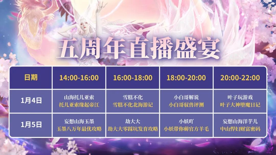 1月4日至1月7日,敬请锁定官方直播间,硬核攻略带你飞,兽娘大咖陪你嗨,更有海量福利拿到手软!这个五周年,山海与你携手共渡,期待我们一同共赴十年之约!