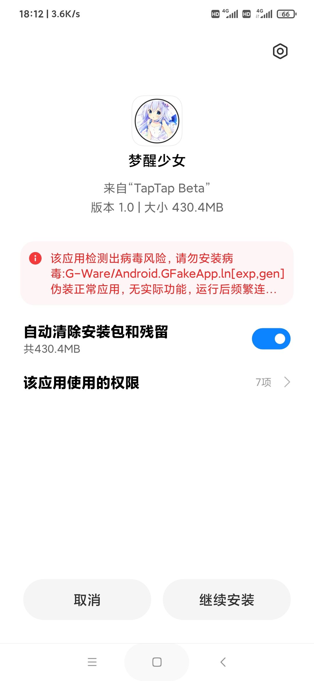 tap的游戏一般都不会有病毒,但是出现这个界面后,以后会被安全管家自动卸载