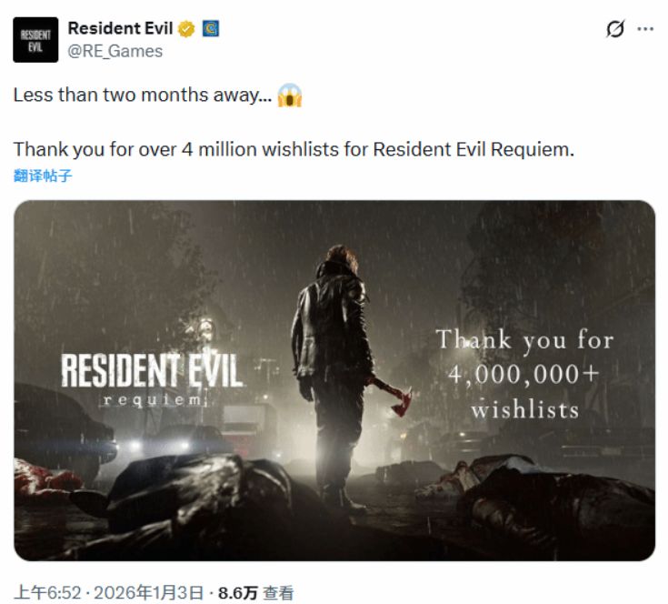今日,《生化危机》官方账号宣布,系列主线第9部正统续作《生化危机:安魂曲》全球愿望单数量已突破400万。距离游戏2026年2月27日正式发售仅剩两个多月,热度持续攀升。
