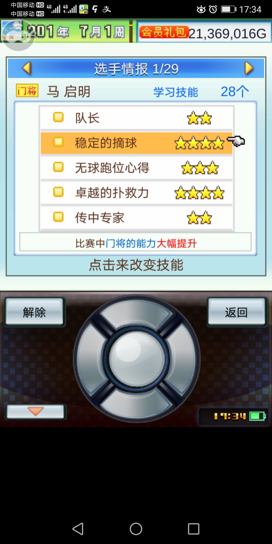 因为其他球员需要装备很多有用的技能,这里把队长位置给到了守门员,加全属性的一个技能。“稳定摘球”,守门员必学。“无球跑位心得”,技能介绍是“足球时增加球员的冲刺力”,我个人理解为“无球时跑的速度会快一些”。“卓越的扑救”,很好理解,守门的固定属性增加。“传中专家”,让球传的更精确,我个人理解为“开大脚球时应该也会传的更精确”(。・ω・。)ノ♡