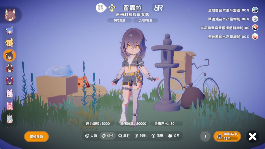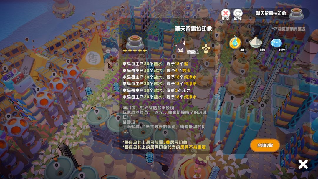 2 - 留露拉可以制作雕像,雕像的作用是每生产X个盐水,赐予1个维生素A/2个甘油/6个盐水/6个水泥/18个纯净水/18个盐/4个梦币/-3压力。(这个X分别是200-150-100-60-30)