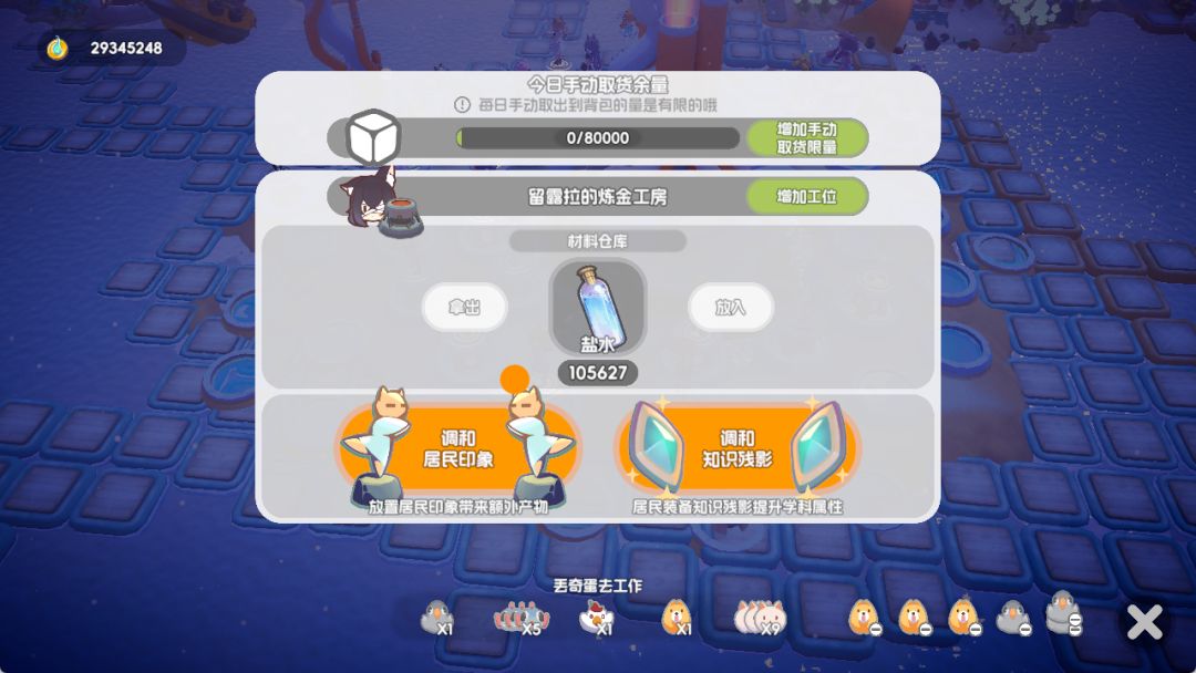1 - 在感受野获得一个盐水的无限量仓库,用感受体还可以增加工位,让猫猫自觉搬到这里存起来。