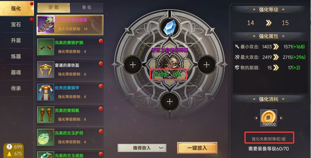 强化需消耗强化石+金币,以提升装备强化等级(初始0级),强化等级越高基础属性加成越多。强化上限随装备穿戴等级解锁:10级上限+4,70级解锁满上限+20,高等级强化将带来质变,是前期提升战力的快捷途径。需要注意,随着强化等级的不断提升,强化成功率将会递减,强化失败时,强化等级下跌。