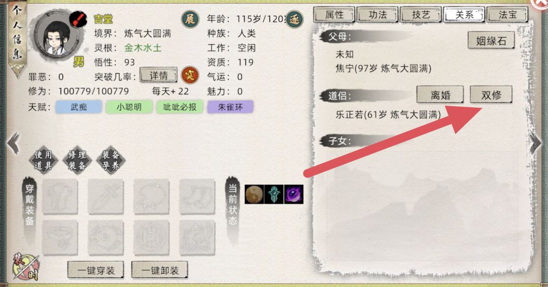 选择结婚的弟子→点击该弟子头像→关系,此时在关系界面会出现双修和离婚按钮。离婚就不用解释了,我们说说双修。点击双修,如果你是主角结婚,此时大世界中你会出现一个摇床效果,双修会消耗600元气,产生一个持续60秒buff ,该buff每10秒将获得经验。