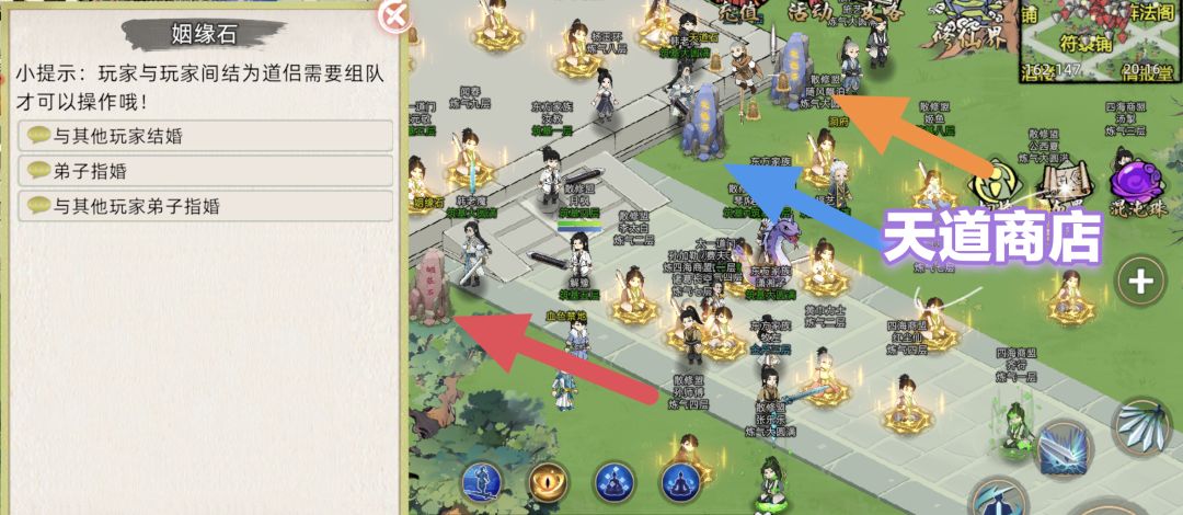 此界面点烟缘石按钮也可为弟子指婚,不必跑去主城中央,但是俩玩家结婚还是要到那去