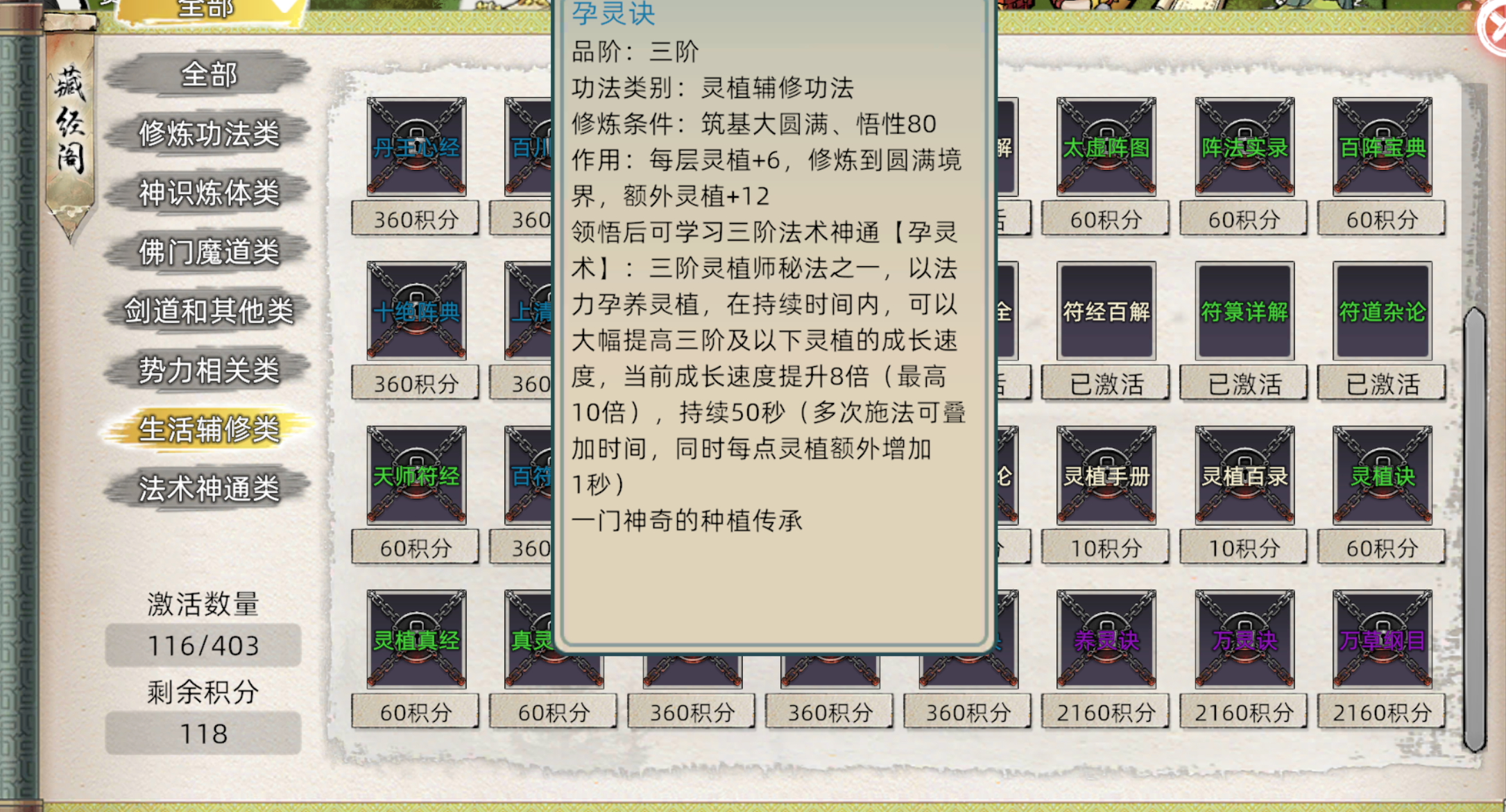 在藏经阁生活辅修类,往下拉可以看到药草技能,效果有直接获得一定成熟天数和加速成长速度。两种种植法效果可以叠加,所以我们一般野外灵脉种植灵草并使用技能加速。当然你也可以种下去就不管,至于是否有人来偷你的菜嘛![[表情_斜眼笑]](https://img.tapimg.com/market/images/d1b1dcc88719f6c9a639728cde152c4b.png)
