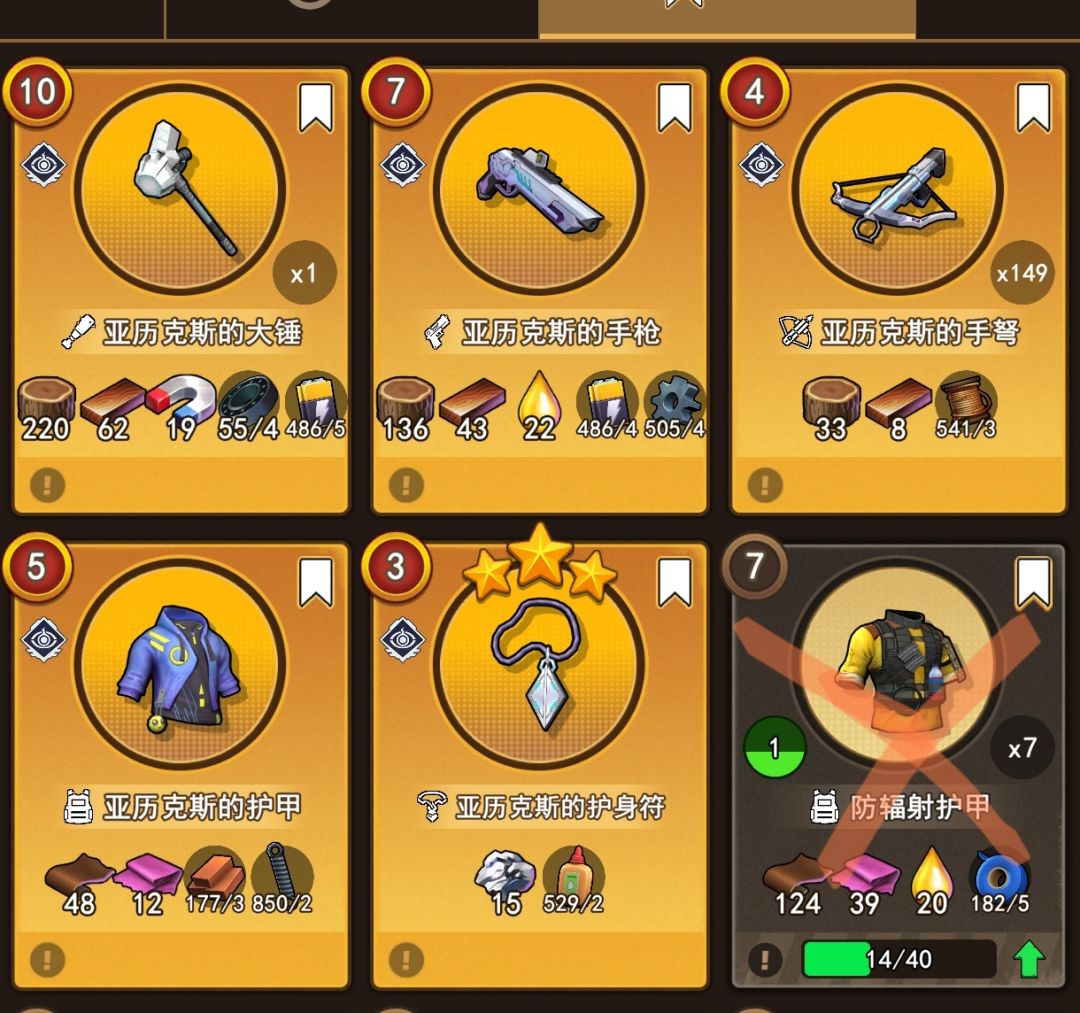 等级越高的装备翻倍好感需求值越高,收益也越高,大后期赚钱就是翻倍十一阶装备了,所以提升好感度上限很重要。如果是购买了亚历克斯工匠的话,那这个阶段可以做亚历克斯项链,亚历克斯弩,亚历克斯手枪这些图纸,然后打上基础芯片翻倍卖收益会更高。市场方面也可以制作次级能源石挂十倍价格放市场卖,有氪金工匠加成赚钱速度会更加快速。