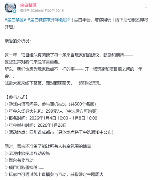 1月2日,国产二次元游戏《尘白禁区》官方发布公告,宣布线下年会活动开启报名,独特的“问卷抽选 + 付费入场” 双重机制却引发玩家大规模争议,“尘白年会神操作:付费解锁发言权” 话题迅速登上贴吧热议榜。