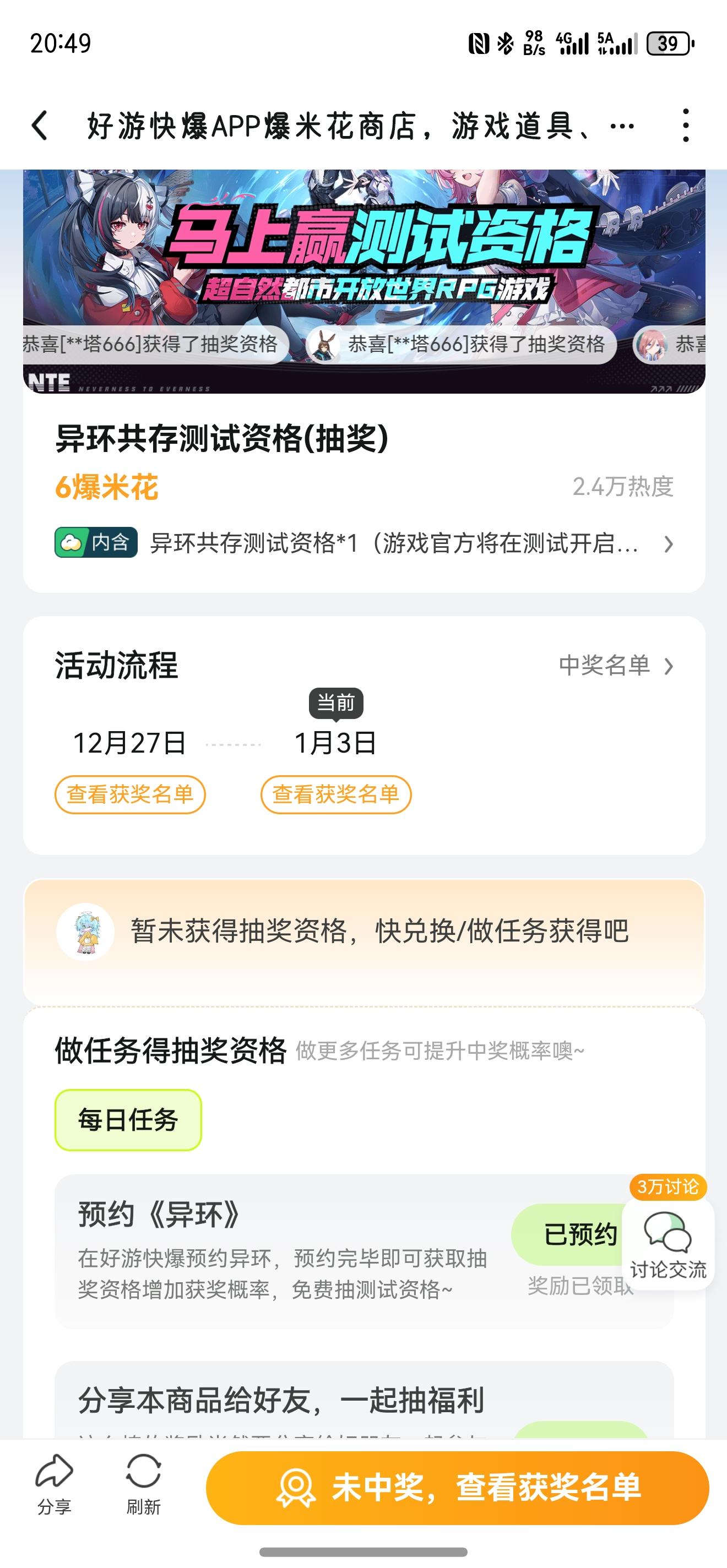 tap,快爆,官网都参与了,而且是把能用的几乎都用了,快爆的爆米花兑换的差不多一百五十几抽,然后每日的次数也几乎都弄了。但是吧,真的很失望,尤其是在某鱼上看到了售卖的资格。有时候我在想这标价售卖的测试资格是不是就是官方单独下放的呢?(当然,这只是猜测,不存在诽谤哈。如果官方能出来解释一下,我是愿意更改我的猜测的。)分享,我也几乎都分享满了,能拿的次数也几乎都拿了,填写测试问卷也填了,能抽的也几乎都抽了。我知道这个资格可能真的有些少,但是我也看到论坛里有些玩家是抽到了两个或几个的,虽然真的有些嫉妒吧,当人家运气好,确实也无可反驳。只是希望官方能好好看看吧,有些真的想体验的没有资格,有些只想着捞点“钱”的售卖资格的却有资格。这确实很令还未体验但想提前体验的待入坑的玩家寒心。