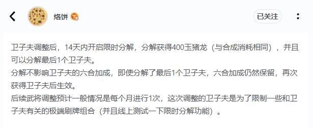 后面的事情大家都知道了,玩家得知如果屯着卫子夫不分解的话,每屯一个可以比别人多300玉猪龙立马炸锅。这个节奏本身是完全可以通过提前修定规则来避免的。结果烙饼及烙饼团队短视,又没抗住压力光速滑跪改为每改动一个将直接原价返玉猪龙。
