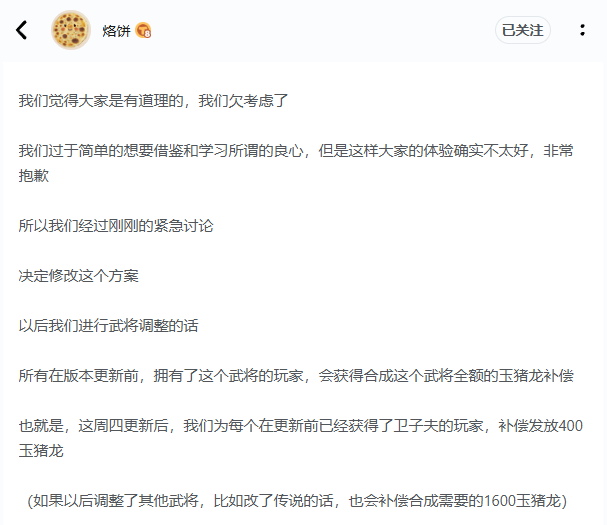 首先这事的锅是烙饼全锅,一开始在设定第一版调整武将原价分解政策的时候就用非常傲慢的心态揣度玩家,认为玉猪龙的资源并不稀缺(可能是烙饼认为他给的福利很好?),因此烙饼认为没有玩家会不分解待价而沽,因此不会不公平。甚至有玩家明确指出这一点的情况下,仍然不予理解。