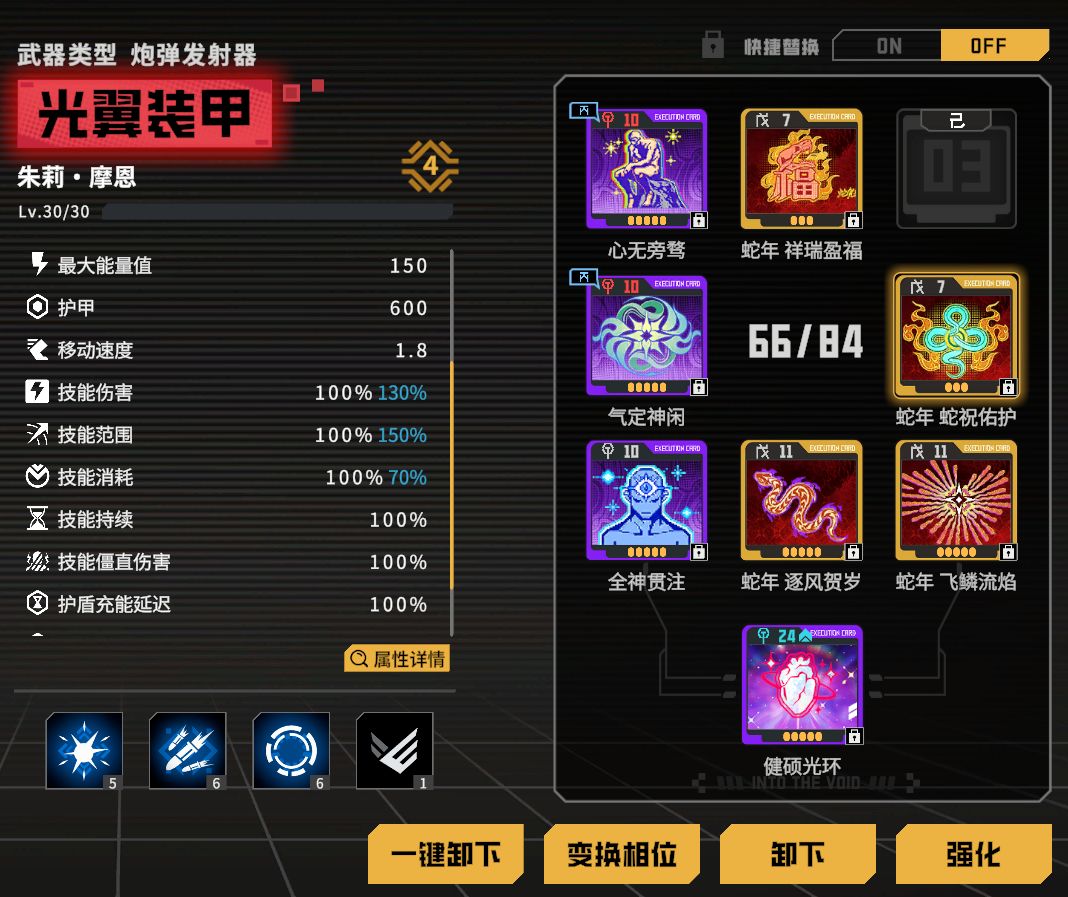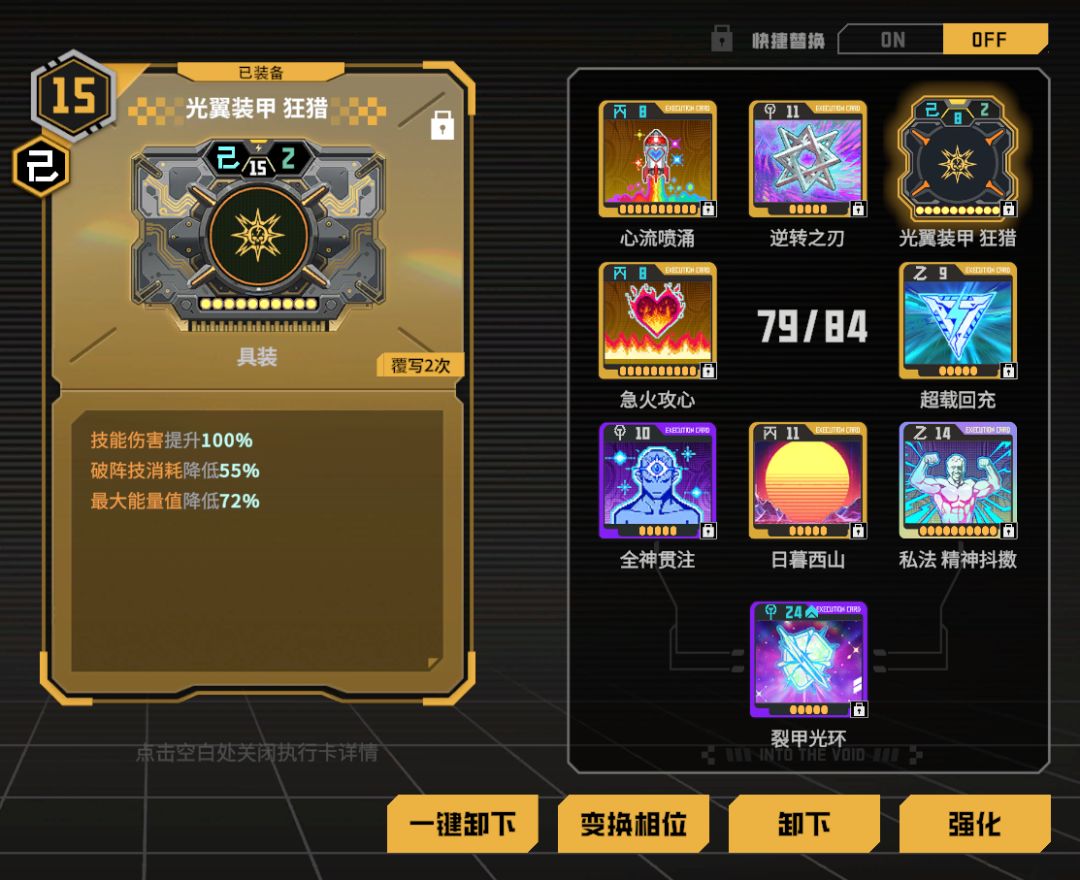 角色紫卡可以大幅度提高光翼强度,追求更高伤害的玩家可以尝试获取;并且可以根据紫卡的效果适当调整配卡:洗出消耗降低或者自回蓝可以考虑搭配超载回充来回蓝