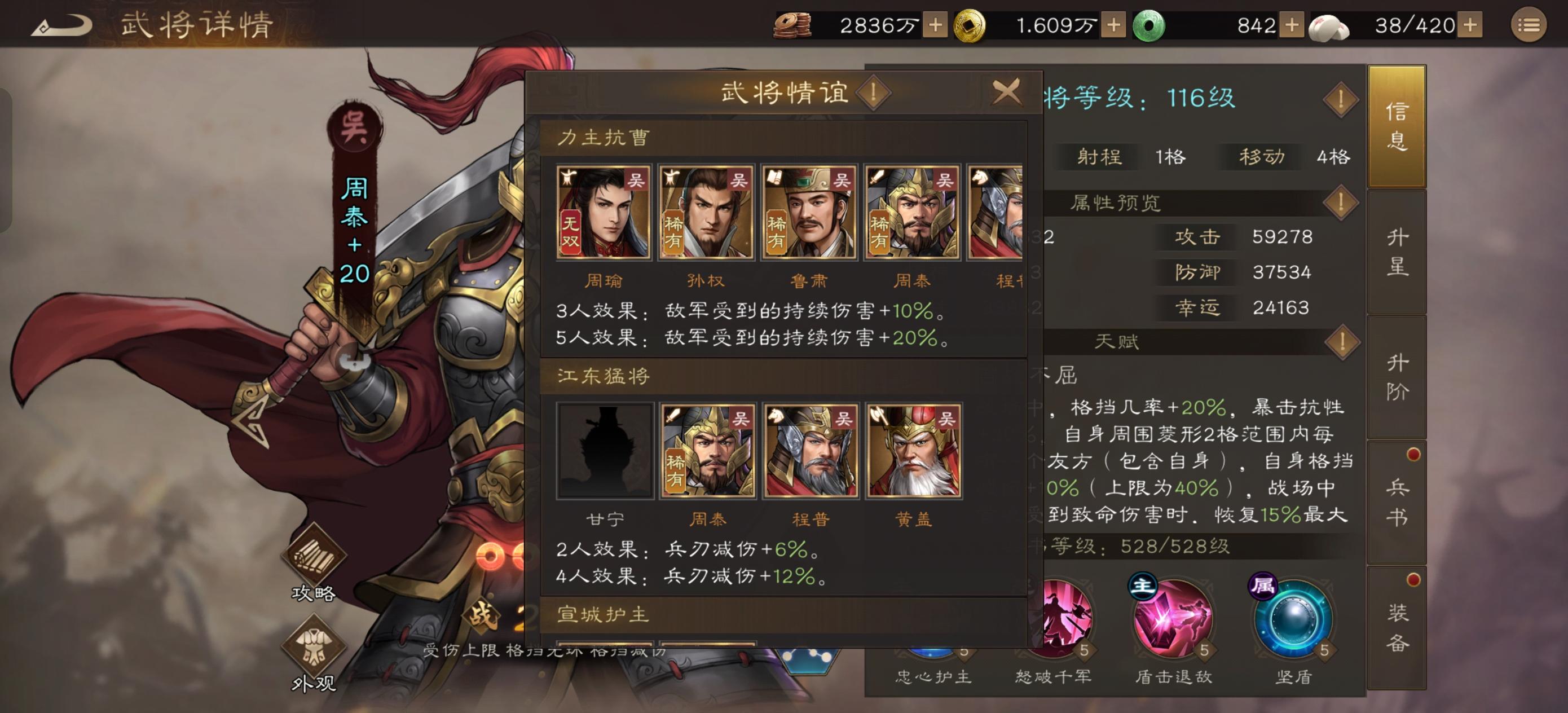 江东猛将:和甘宁、程普、黄盖一起上阵。2人激活:兵刃减伤加6%;4人激活:兵刃减伤加12%。