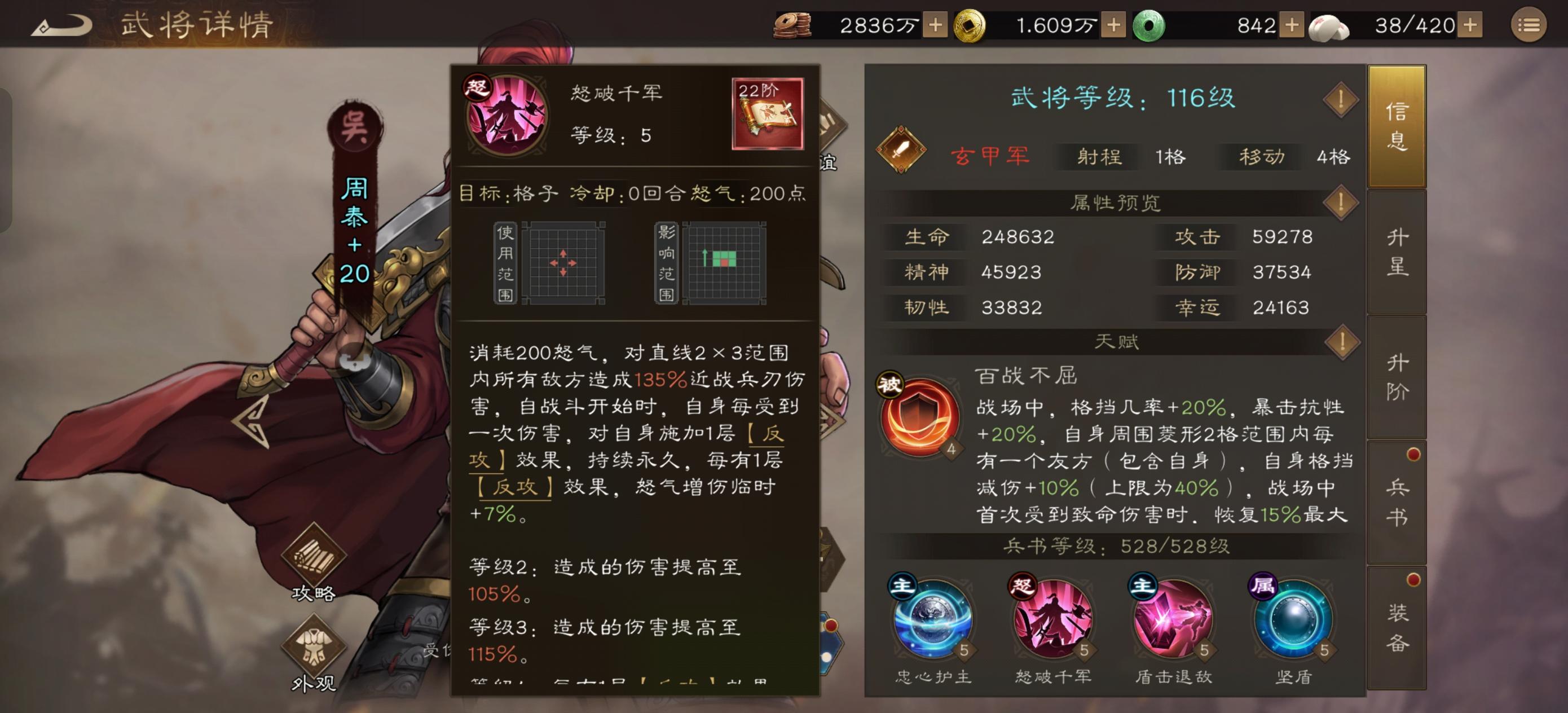 消耗怒气,对一条直线上的敌人造成135%近战伤害。核心效果是:战斗里周泰每挨打一次,就叠一层【反攻】(永久持续),每层让这个技能的临时伤害加成提高7%。所以越挨打,这招伤害越高。
