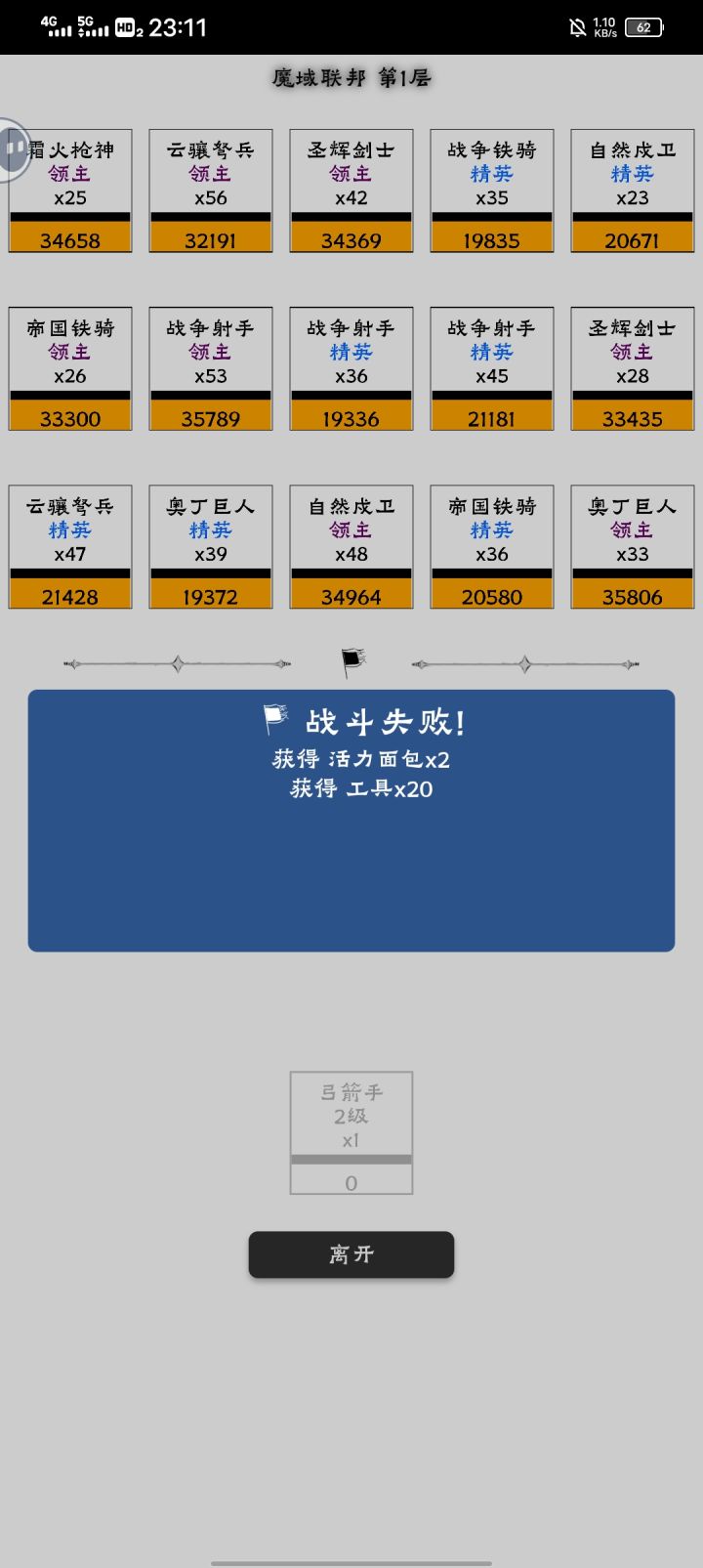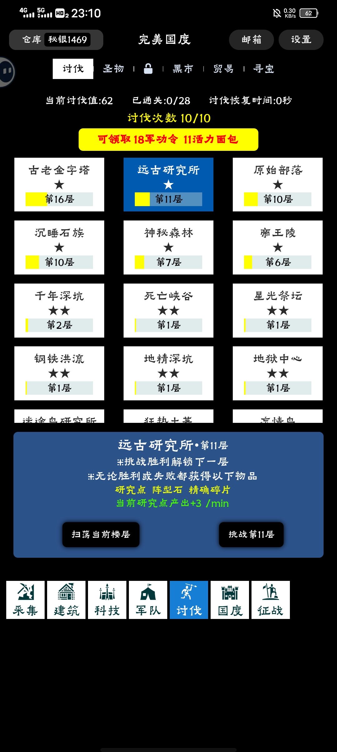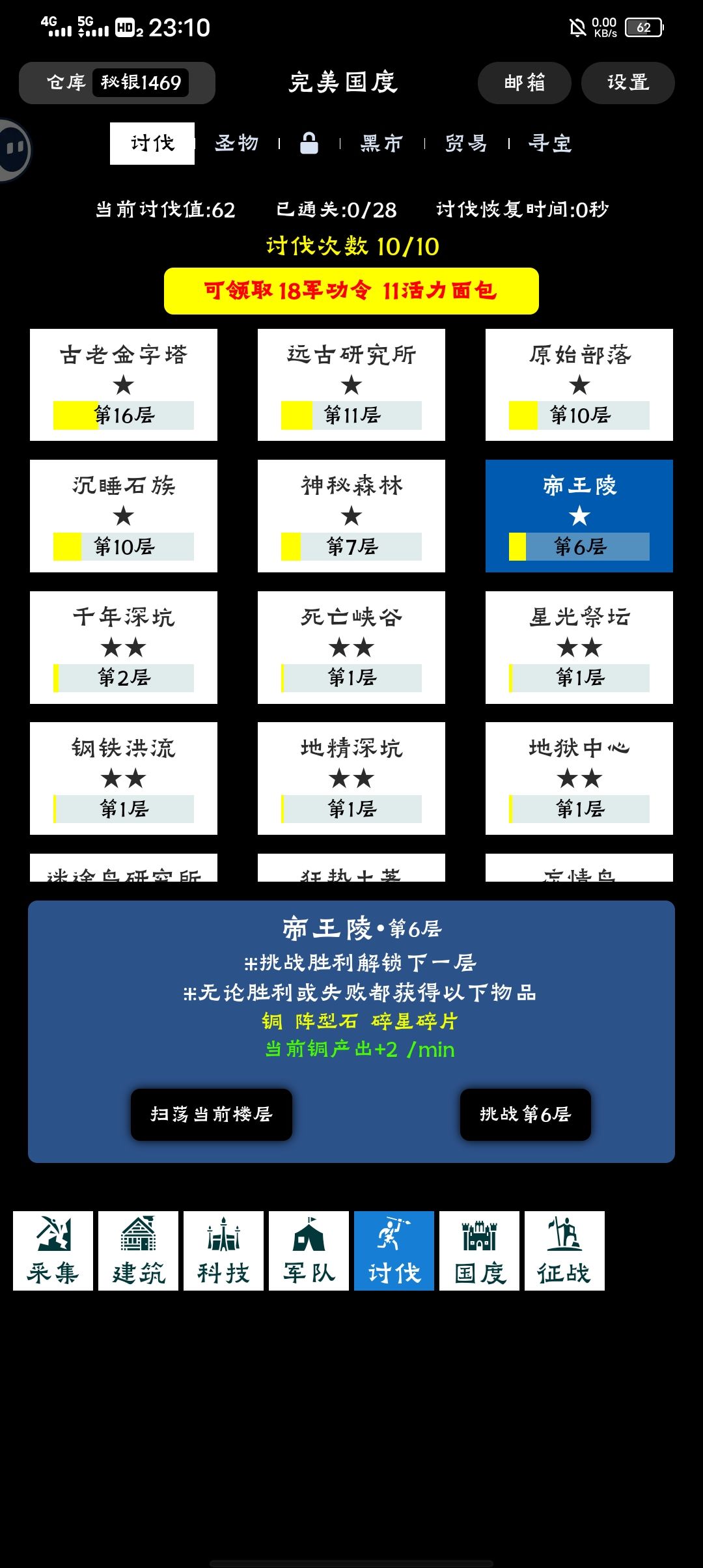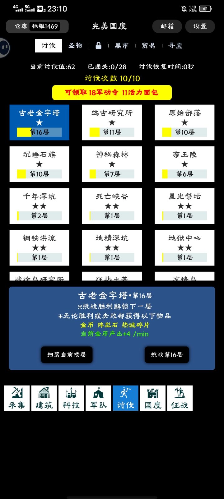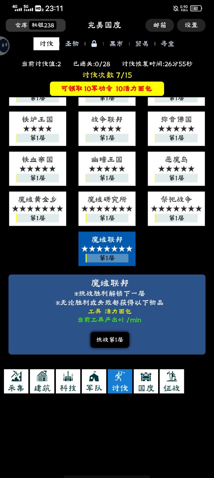 1. 先说结论 此方法讨伐可以在前期比别人讨伐多10倍的资源量 首先讨伐是赢了输了奖励都是一样的 且半小时会增加一次讨伐 看到上限就直接打 金字塔保底20金币 魔域联邦保底20工具和俩面包 工具前期也需要相当于凭白比别人多两个面包 活力点加资源是根据资源建筑等级来的建议前期加木石食钱 第一天直接领取10面包军功快速发育