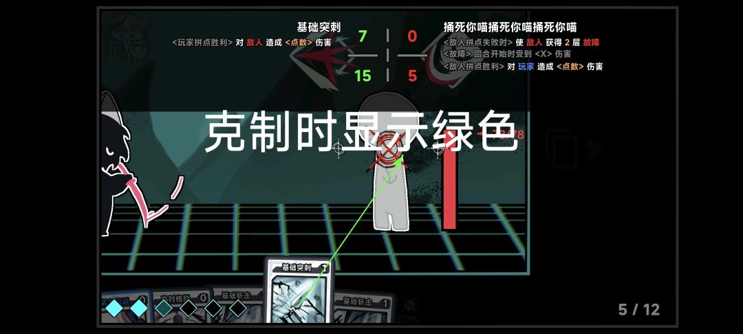 卡牌分为突刺(基础突刺)打击(基础打击)斩击(基础斩击)闪避(紧急闪避)防御(临时隔挡)这几类,属性在卡牌左下角可以看到,点击卡牌拖动到意图也会有属性投影