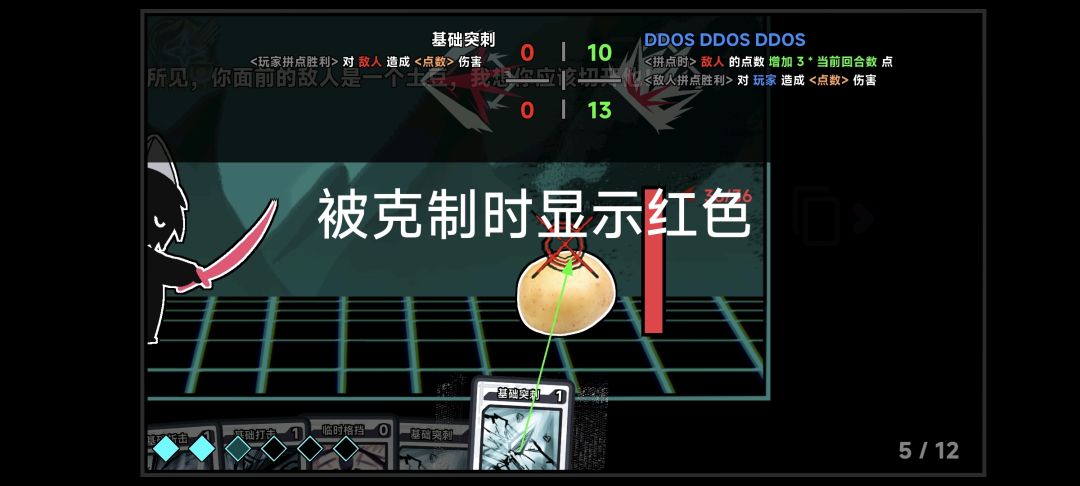 普通攻击卡(斩击,突刺,打击)在使用后会和对方拼点,横线上是最小点数,下面是最高点数,拼点时双方区随机值,点数大者造成点数伤害。防御卡使用后会固定减少点数伤害,如果自身点数大于对方则不会受到伤害,闪避卡如果点数大于等于对方则不会受到伤害,小于对方会受到全额伤害