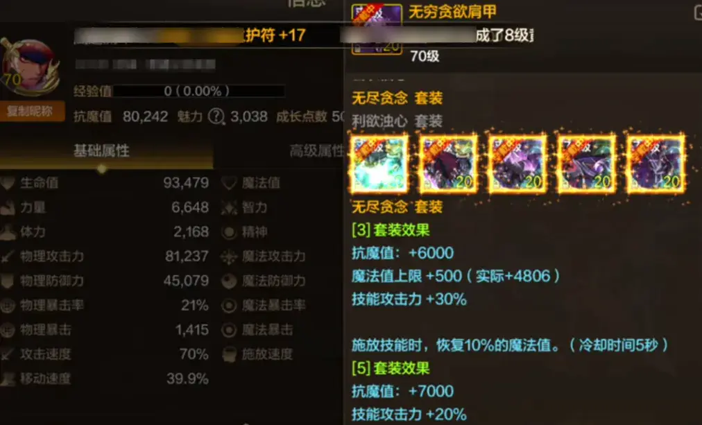 然后是“二傻”无尽贪恋套,这套装备光看属性感觉还挺牛的,既有冷却、又有技攻,还可以来回切换用。