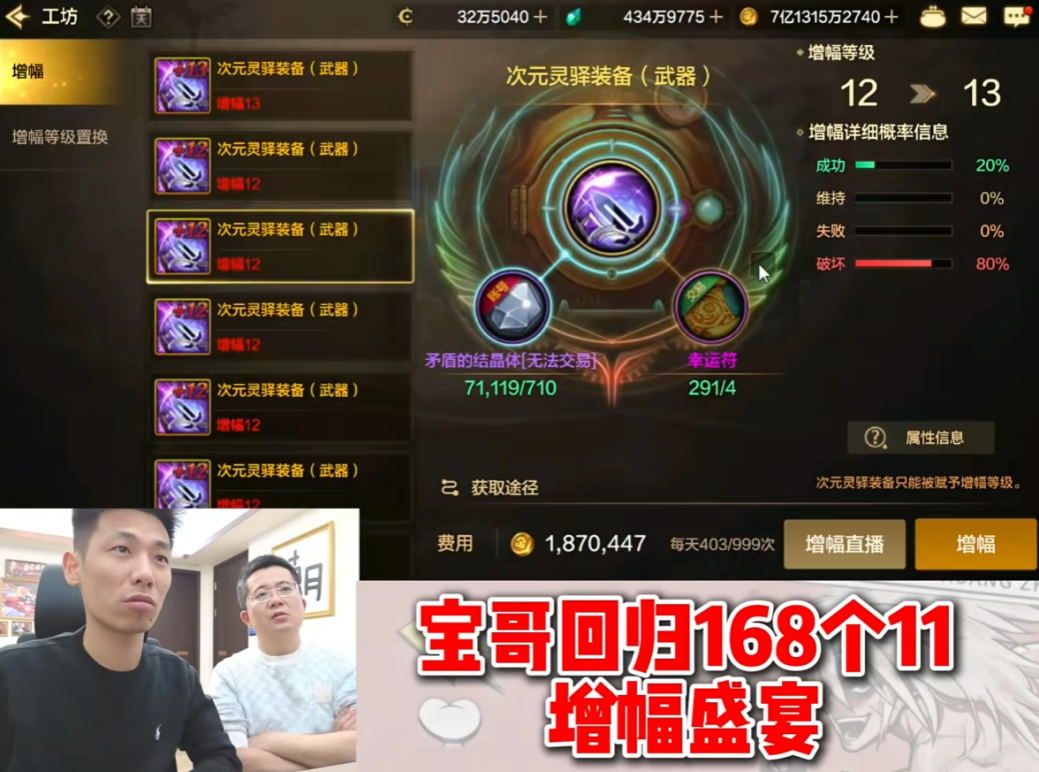 但是到增幅13时宝哥又把这概率补了回来,按照56件12的概率能成13件13,宝哥仅靠42件12就成了13件,再次把概率补了回来