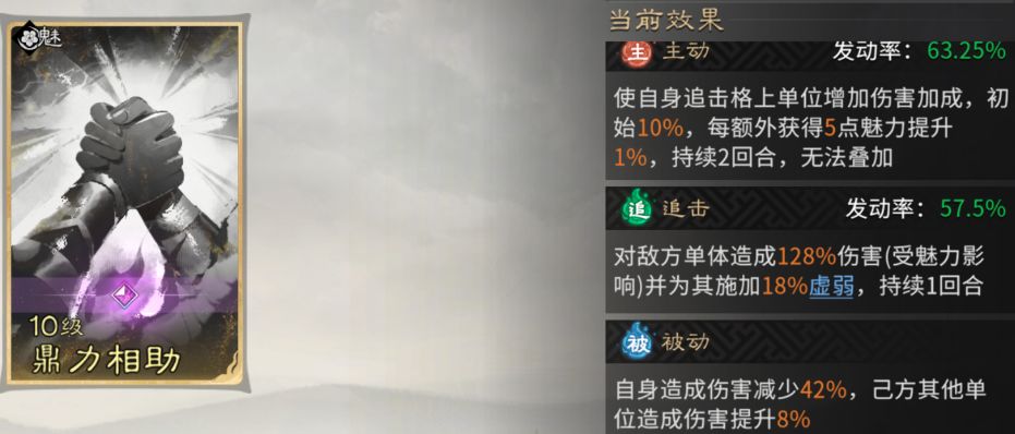 蔡文姬:主动与被动技能均固定携带【鼎力相助】,可显著提升位于其追击格上单位的输出;作为被动生效时,将减少自身伤害转化为全队伤害增益。