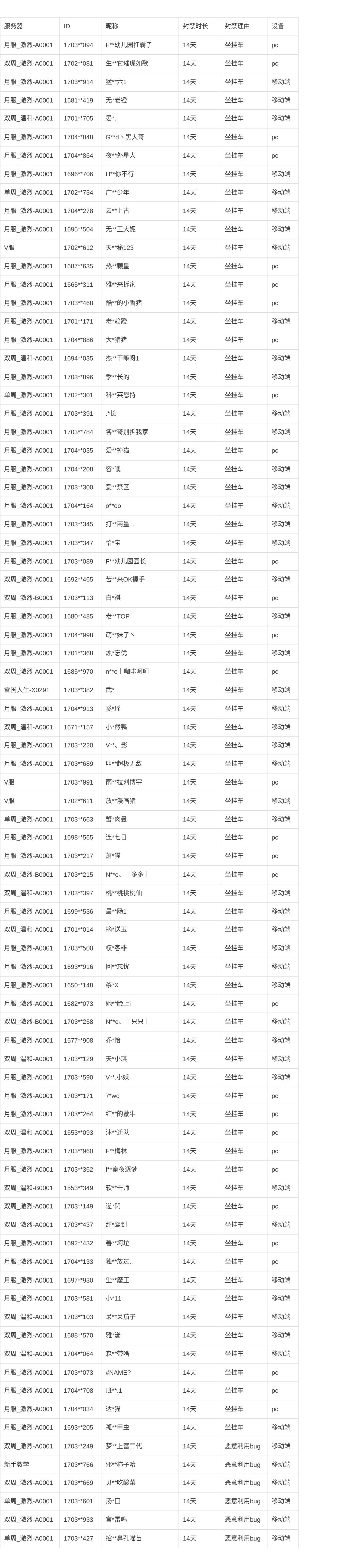 以下为近期因违规处罚情节较重的玩家公示名单,相关角色已进行复核,违规属实。如有任何疑问,请通过游戏内客服进行反馈。
