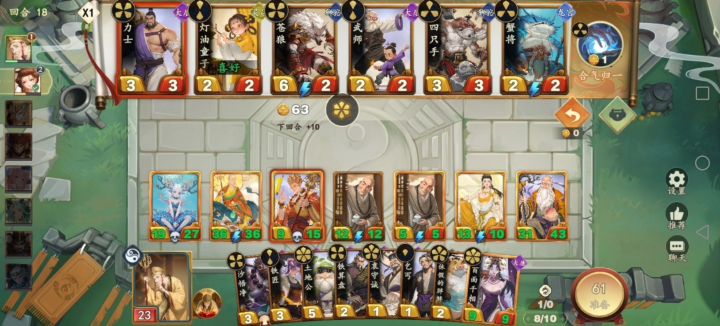 对策思路:打大鹏要带隐匿,打天地俱灭、缺心眼、先机狼等全场伤害要留欢喜罗汉上盾,珊瑚最好挂护卫防地藏被偷掉,打内战就养身材(这阵容经济完全溢出,图一溢出六十多块;可以配合阿难猛刷身材,图三15回合身材)