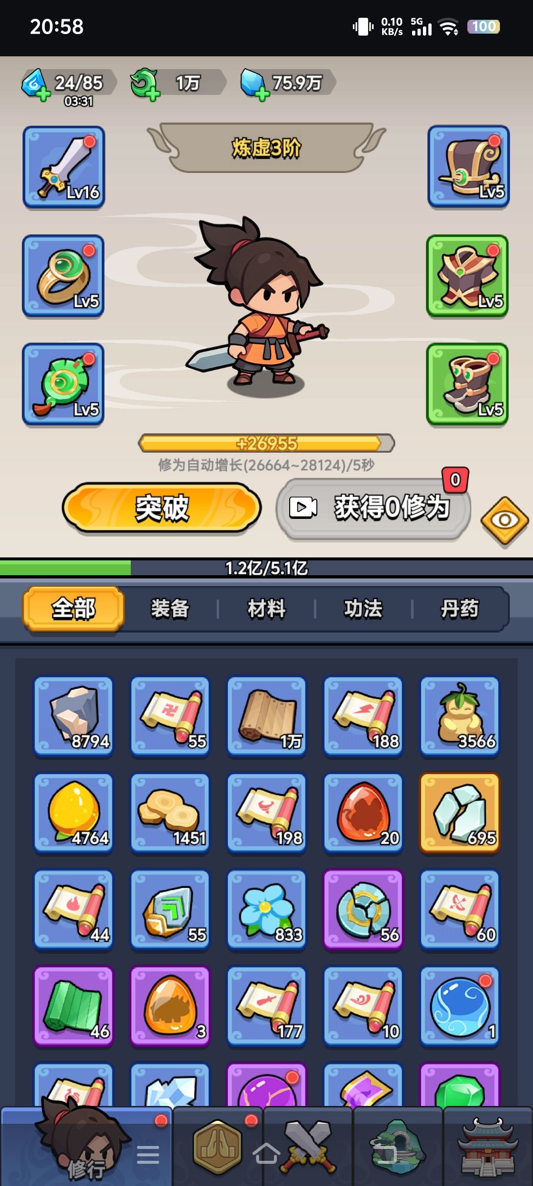 优先升级玄天宝树,吃修为丹额外获得修为。