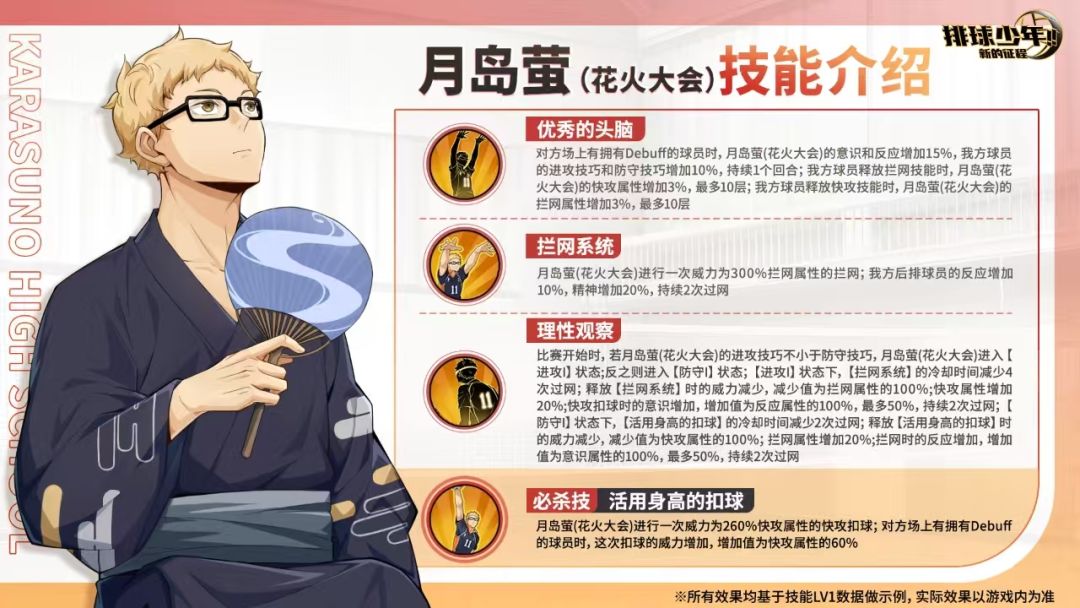 触发羁绊后,我方球员传球时,意识增加;日向翔阳(赏樱)扣球超常发挥时,【高高跃起的扣球】冷却时间减少,月岛萤(花火大会)的意识增加。