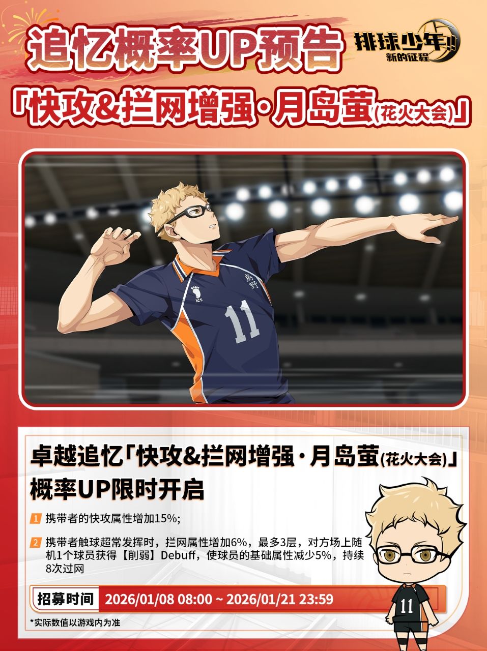 🏐卓越追忆招募限时开启:「快攻&拦网增强・月岛萤(花火大会)」。