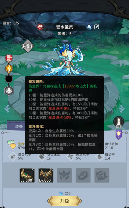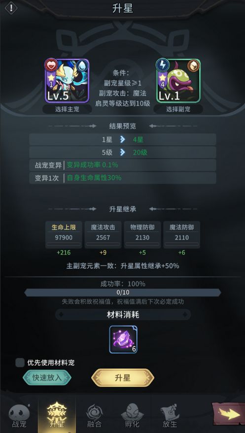 4.战宠可以通过升星、融合来提升属性上限战宠升星可以突破等级上限和变异,但升星时有一定概率失败,升星失败时,积累祝福值,祝福值满后,下一次升星必定成功