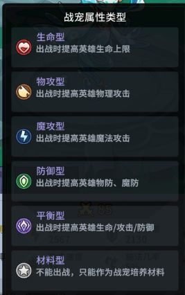 2.战宠分为六大类型,每种类型将决定战宠带给英雄的属性,除此之外,战宠也拥有元素克制玩法,元素克制时会造成额外伤害,被克制时则相反