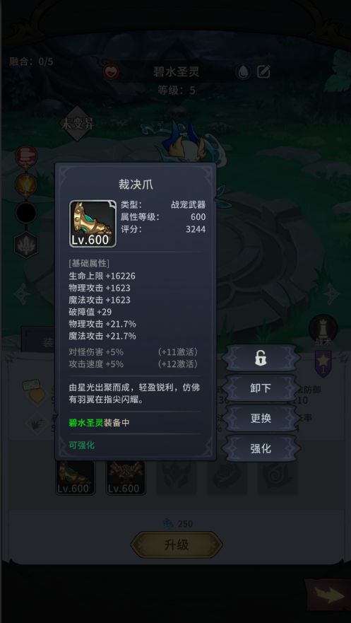 6.在战宠升级界面底部有装备穿戴功能,战宠装备分为5个部位,集齐套装会有套装属性,且可以强化、注魂,但是无法交易