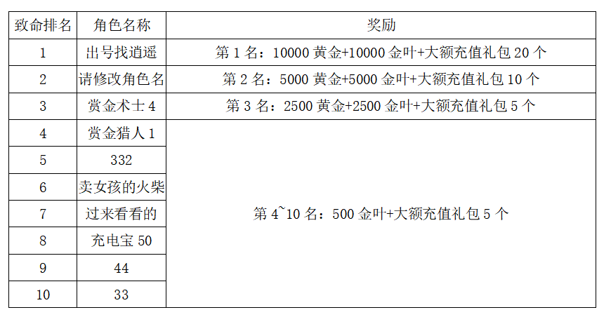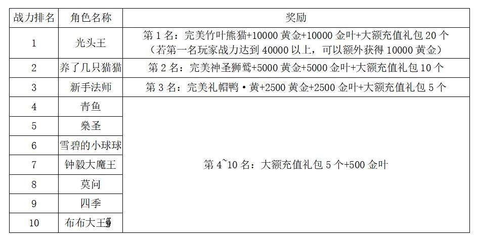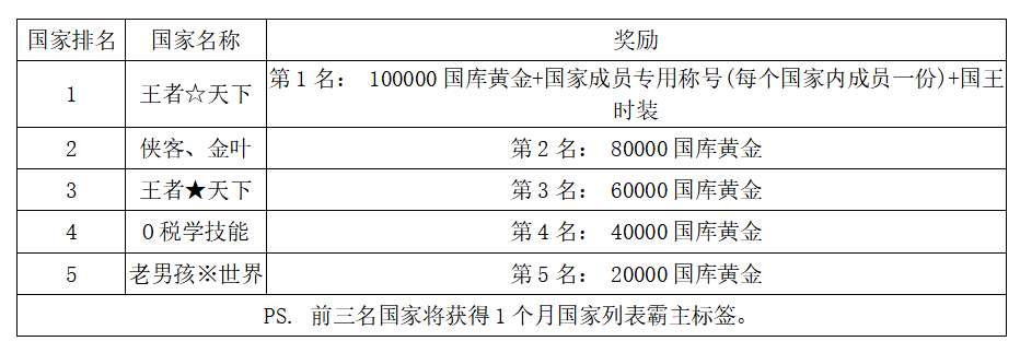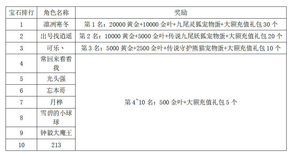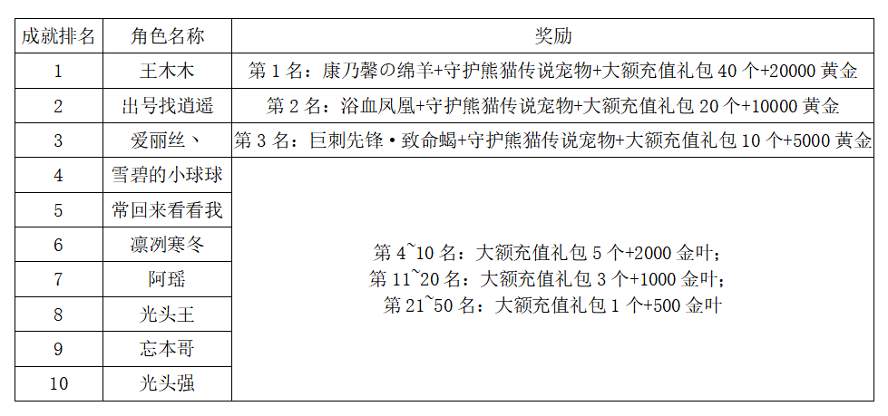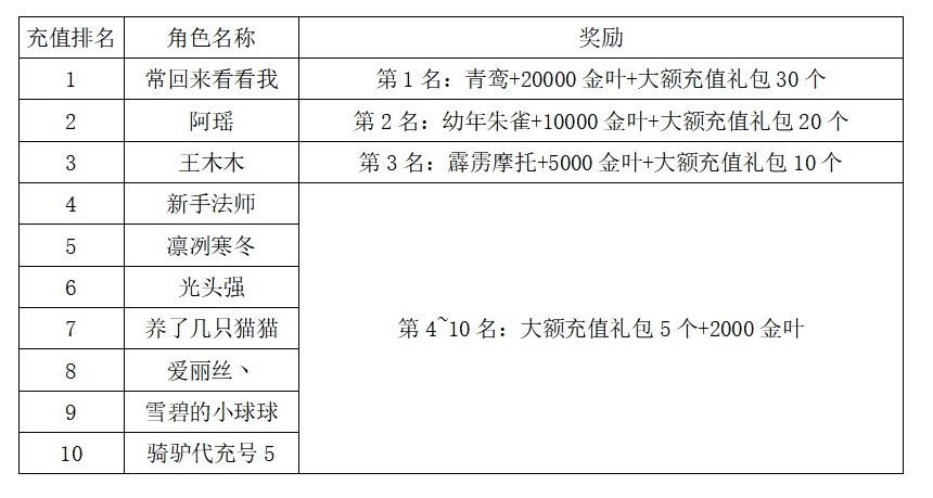 注:以上活动排名均以服务器时间为准。新区排行榜活动如发现存在违反游戏相关规定使用游戏外的辅助工具进行作弊将取消获奖资格。