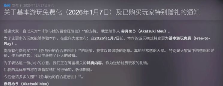 Steam福利上新!病娇百合恐怖视觉小说《你与她的百合狂想曲》制作人赤月めう(Akatsuki Meu)官宣,自2026年1月7日起游戏将转为免费游玩模式,此前已付费购买的玩家可额外获得专属特典内容。