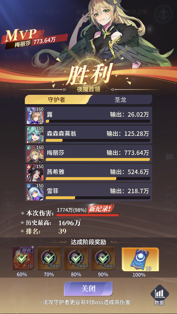 随着守护者等级的不断提升,装备的不断强化今天的夜魔首领挑战破新纪录喽,虽然记录目前只有一千七百多万,但是在我的不断努力后面的记录肯定会越来越高的!