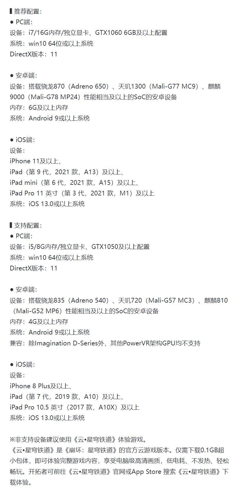 今日,米哈游发布官方公告,为支撑后续版本内容更新与优化游戏表现,《崩坏:星穹铁道》4.0 版本将正式提升设备性能要求,PC、安卓、iOS三端的推荐配置与支持配置均有调整。