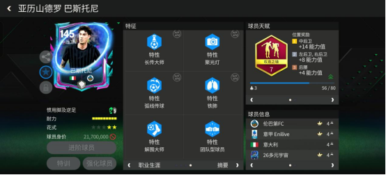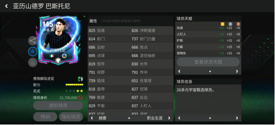 巴斯托尼,意大利国脚,现效力于国际米兰,是欧洲足坛最具潜力的左脚中卫之一。他以出色的出球能力、防守预判和冷静的防守风格著称,是现代中卫的典型代表。在游戏中,他也是一位既能防守又能组织进攻的全面型中卫。