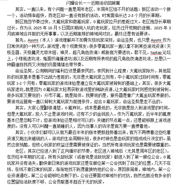 新区抱怨节奏过快,大氪玩家和微氪玩家、0氪玩家拉开的差距过大。老区抱怨长草期过长。作为从2025年10月5日国庆期间入坑的老玩家,经历过开荒期的迷惘、2025年3月底神域合并前的无所事事,以及近期高频的神域间对抗,最终还是有话要讲。