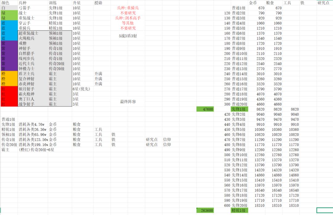5.训练部队:兵营(普通、中级、高级),兵种品阶分为:白,绿,蓝,紫,橙,红。兵种可以使用资源进行训练(主要提升提供),升星:消耗多余的部队最多10星(收益中等),还有武器等等