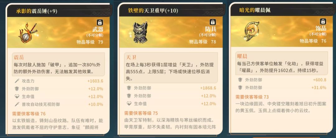 后期装备可以通过张凌霄相关的天卫军势力任务以及滨海区域燕京的支线任务获得装备“震岳锤”、“天卫重甲”、“曜晨佩”的装备三件套,可以大幅度提高外防,并且装备效果非常适配张凌霄的技能。