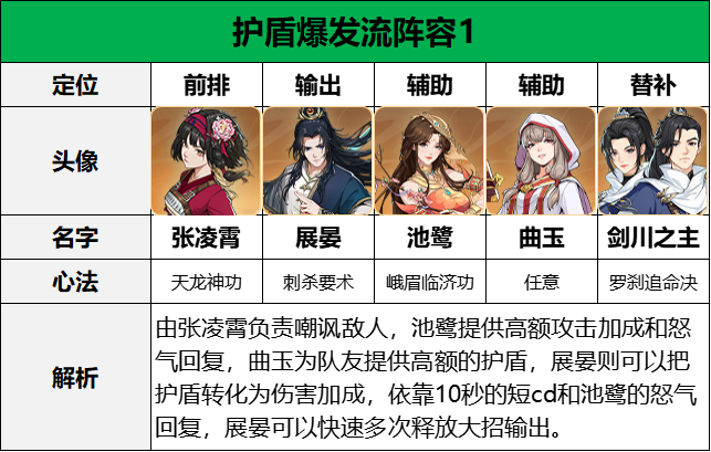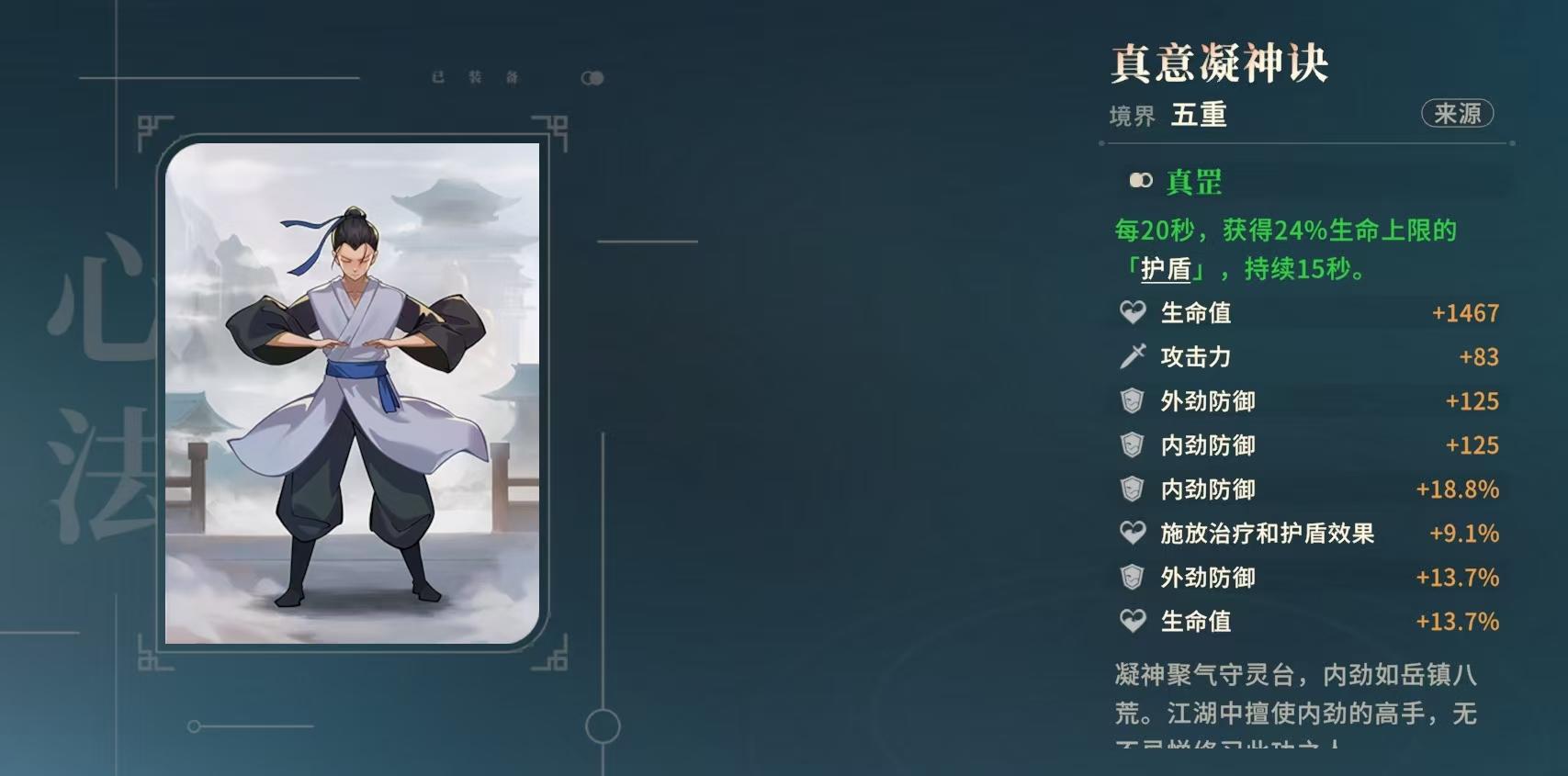 前期过度时,或者应对大部分内劲伤害敌人时,则可以选择《真意凝神决》,心法本身携带30%内防提高,被动也能频繁的添加高额的护盾,能承受不少的内劲伤害。