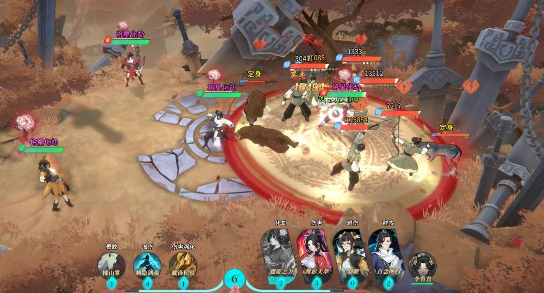 2.南锤队:主角的技能可以切换,建议普攻拳法+两个群攻根据情况切换。大部分情况用2费的群攻就可以,像特殊挑战类又多批次群怪可以换成3费的大风车,第一批小怪转完,第二批的小怪还能继续转,伤害不会浪费。资源够多的话,李香君可以突破觉醒成为金色角色,治疗量也是非常不错的。