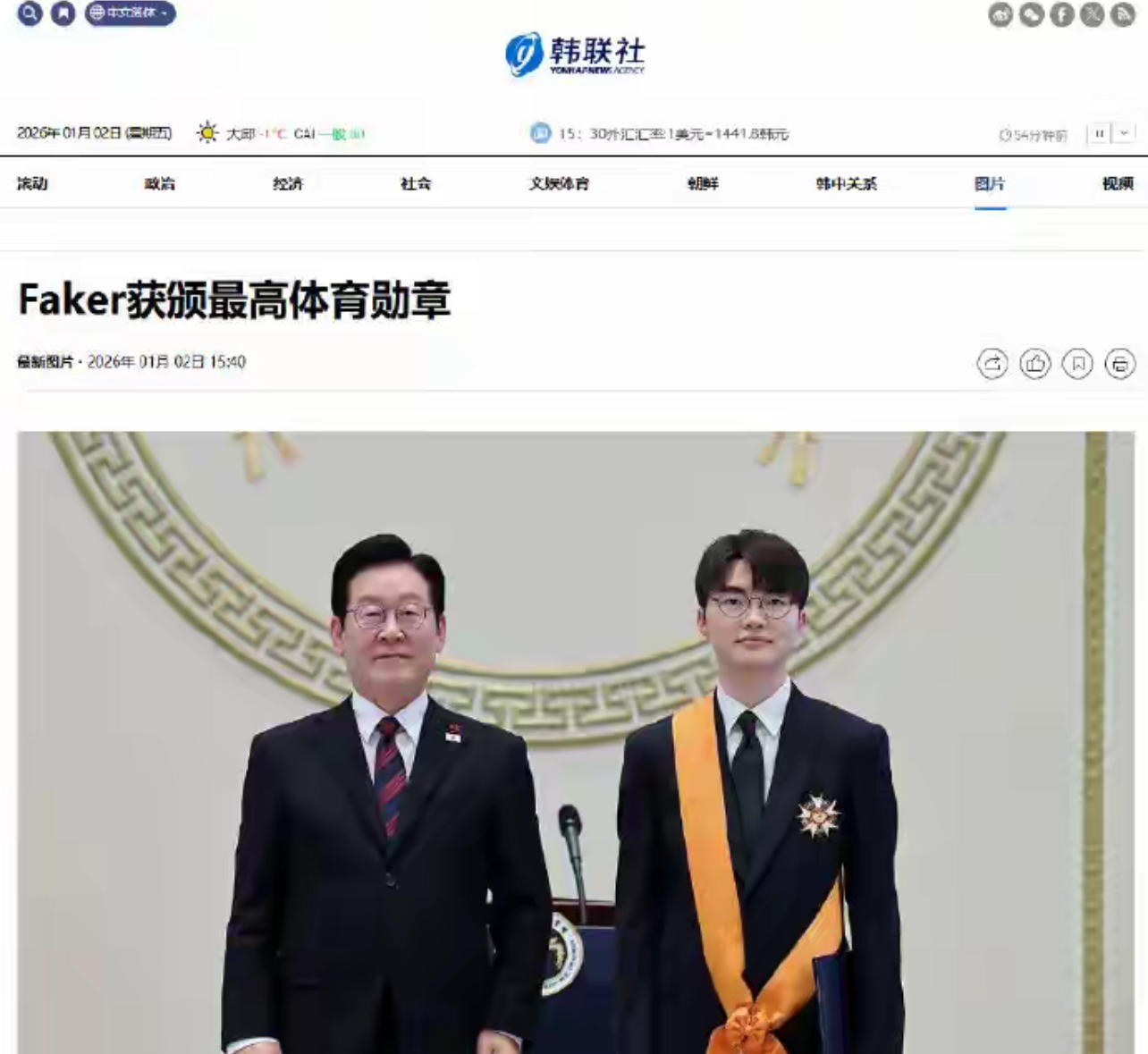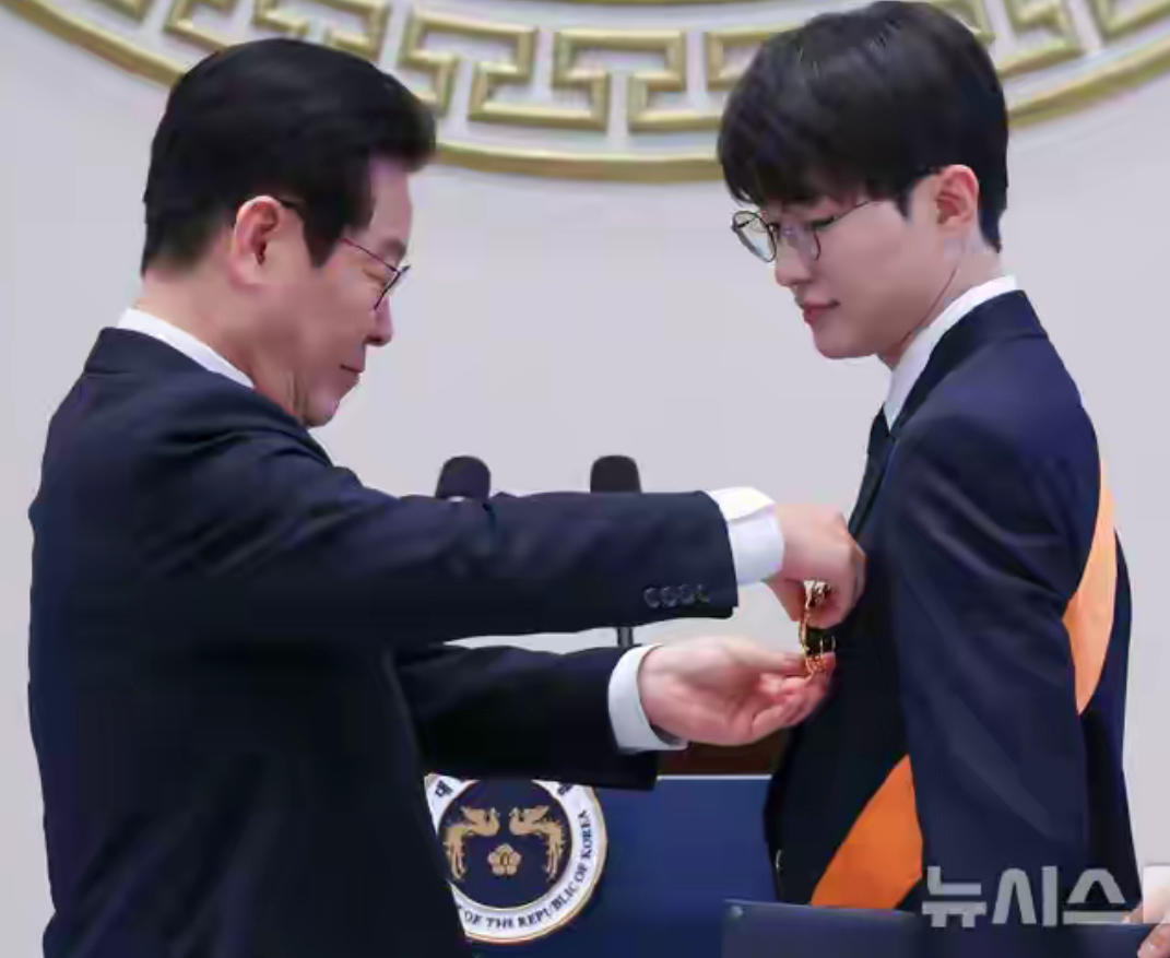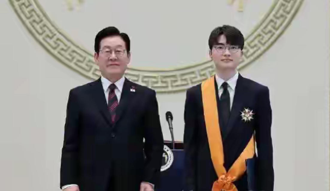 《英雄联盟》传奇选手Faker李相赫,从韩国总统李在明手里接过了青龙章,这是韩国体育界的最高荣誉。