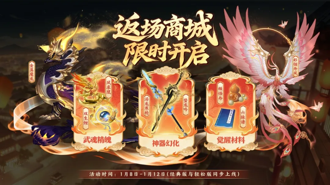 送别元旦的钟声,我们正式踏进2026的江湖。新年刚启程,为弥补众多少侠没有得到心仪宝物的遗憾,在1月8日-1月12日期间隆重推出返场商城!