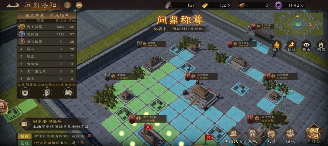 人多了以后,问鼎还是比较热闹的!盟主比较上心,每次问鼎之前都会提前说一下这次问鼎的目标和策略。遇到强大的敌人只能尽量多占地,遇到势均力敌的敌人就拼得比较狠!记得有一次我们和其他三个战力基本相同的盟分到一起,最后决战的时候四家轮流占皇宫,我们最终险胜!场面相当壮观!