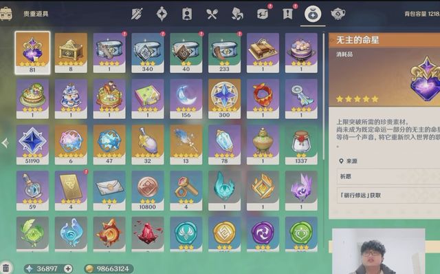 最后,拾柒看了下大佬的仓库,虽然说,任务道具人人平等,但是当我看到贵重道具里还有88个“无主命星”的时候,再一次被震惊到了,啊,不是?你跟我说,我每次用之前得纠结几天的玩意,你有81个?