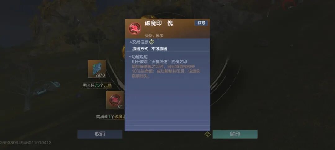 其中破魔印可在新玩法【太浊之隙】中获得,而高级的破魔印(煞、魇)还可以在拍卖行购买获取。(傀无法交易)
