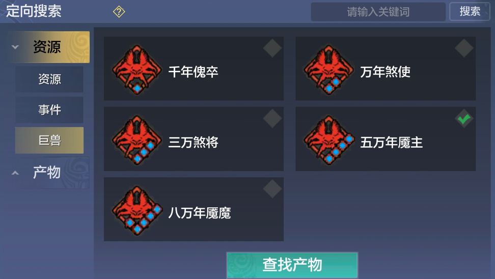 若旅者想定向寻找特定年份的魔化兽,也可通过【搜索-定向-资源-巨兽】精准搜索。